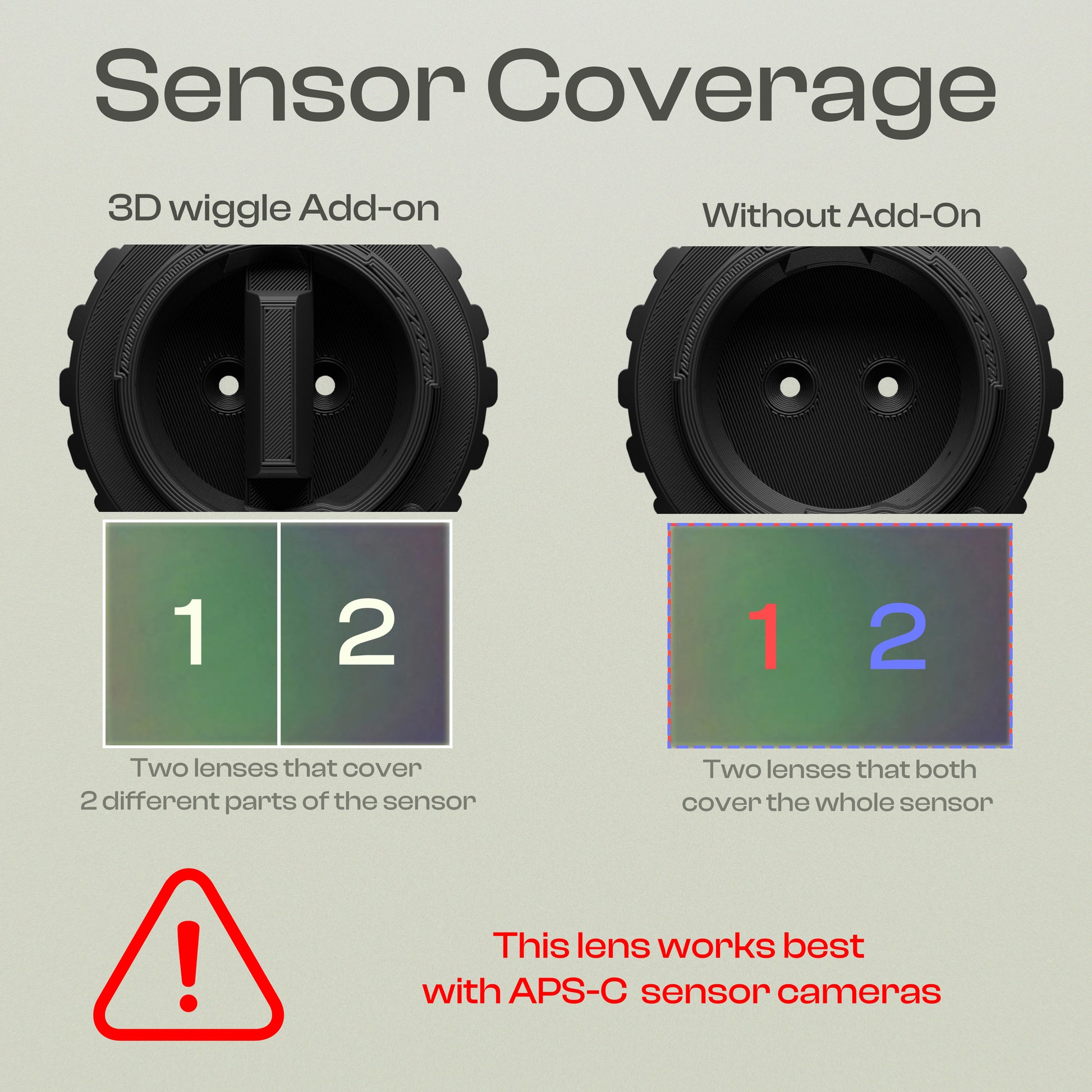 The WiggleLens 2 is designed specifically for APS-C / crop sensor cameras and allows you to easily create the iconic 3D wiggle effect. Capture two perspectives in a single shot and turn them into smooth 3D wiggle videos using our free web tool: